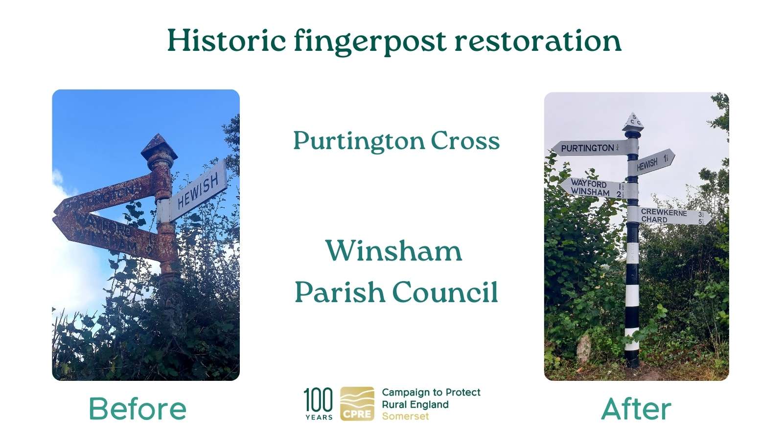 If you know of a traditional cast iron Somerset fingerpost in need of some TLC, please get in touch on admin@cpresomerset.org.uk and we will explain how to apply for our funding in 2026.